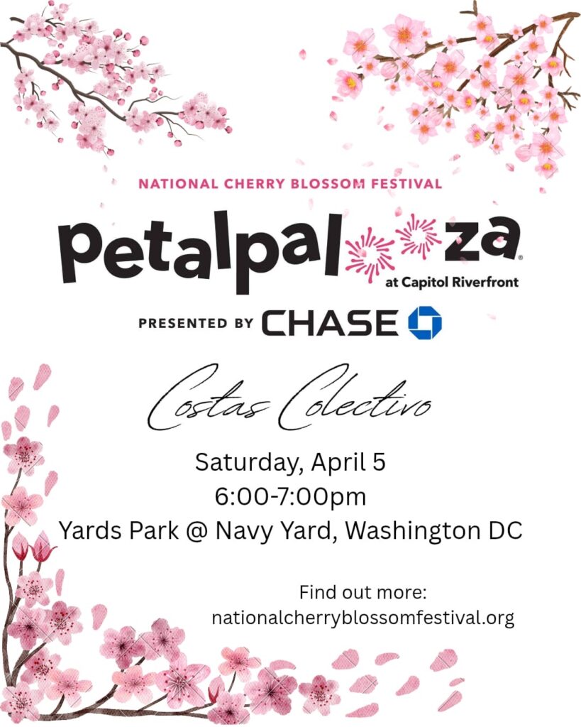 Come out to hear me perform with Costas Colectivos, a DC based Salsa Band, at this years National Cherry Blossom Festival at the main stage. We will be performing a mix of Salsa, Merengue, Bachata, and more! You won’t want to miss this show!